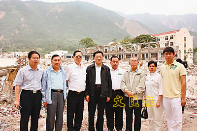 ■面對北川中學的廢墟,林軍及陳有慶、余國春、林廣兆、顏寶鈴、邱維廉、林龍安、邵誠、顏肇翰等一臉凝重。