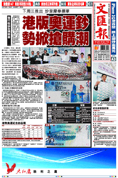 【本報訊】(記者 嚴敏慧)繼內地發行人民幣奧運紀念鈔票後,中國銀行(香港)昨日宣布,為迎接及紀念北京奧運會,香港將於下周三(16日)起一連14日,發行400萬張、面值20元的「北京2008年奧運會港幣紀念鈔票」,每張及每套的售價分別由138元至1,388元。這是現代奧運史上首套港幣奧運紀念鈔,意義重大;其中35連張的紀念鈔最為罕有,且數量有限,銀行相信這批紀念鈔會旋即被搶購一空。