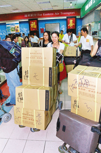 當日下午,共有北京和江蘇的6個首發團,約190人結束7夜8天的環島之行離台。記者在機場發現,幾乎所有團員都是大包小包,滿載而歸。一些人甚至因為行李超重,要由其他團員分擔部分行李。機場所見一箱又一箱裝得滿滿,都是特意買回去給大陸親友分享的禮品。其中最受歡迎的是鳳梨酥,幾乎是每個遊客都必買的特產。