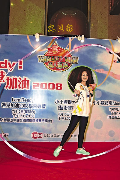 【本報訊】鄭融昨日參加活動,即場示範藝術體操,以優美動作為活動揭開序幕。那是由長江實業地產發展有限公司旗下天水圍「嘉湖銀座」商場及紅磡「漁人碼頭」商場主辦之「I am Ready! 香港加油2008」,於7月12日假紅磡「漁人碼頭」商場舉行揭幕禮,並由長江實業地產投資有限公司董事黃思行小姐聯同鄭融、國內體操代表隊及香港體操代表隊成員一同主持揭幕儀式。