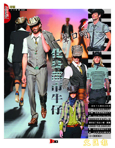 沒有了大漠狂沙的背景,也沒有褪到發白的牛仔褲。到底是時裝設計大師,Jean-Paul Gaultier設計的明年春夏男裝,不僅保留了俏皮小帽,還讓模特兒一律戴上齊肩假髮,他的招牌條紋引俗入雅,牛仔們好似聽到哨聲,紛至沓來。