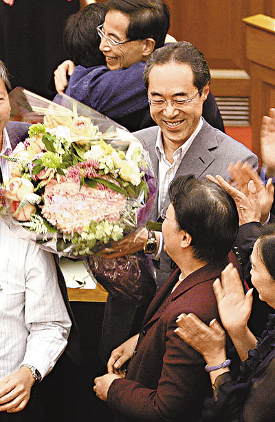 ■唐英年在告別議案結束後,代表特區政府向范太送上鮮花,以表示謝意。