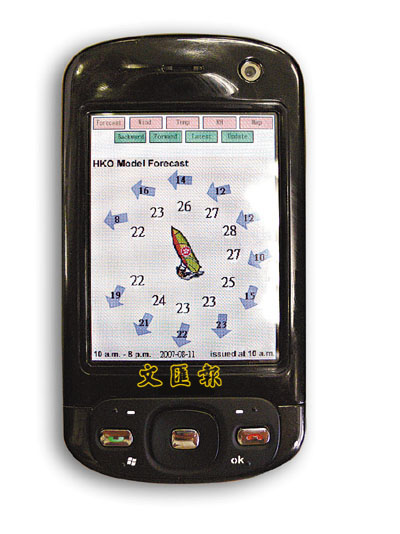 【本報訊】風帆比賽中,風的變化對賽事的勝負影響至為重要。香港風帆代表隊繼雅典奧運後,再次邀請天文台於奧運風帆賽在青島舉行期間,利用「秘密武器」─電子手帳,「越洋」為風帆代表隊提供青島的實時天氣數據,讓香港風帆代表隊盡掌天機,充分了解青島海面溫度、風向、風速等資訊,方便教練能隨時改變作戰策略。