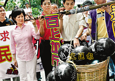 匯賢智庫昨舉行抗議通脹大遊行,匯賢智庫主席葉劉淑儀、皮膚科專家醫生史泰祖等參加。他們要求政府引入食物券、取消外傭稅、對殘疾人士實施半價優惠等措施,以減輕市民的負擔。 本報記者莫雪芝 攝