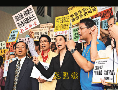 ■陳鑑林、黃國健等100多名民建聯、工聯會和公屋聯會代表,要求政府重新出售公屋,復建居屋。本報記者彭子文 攝
