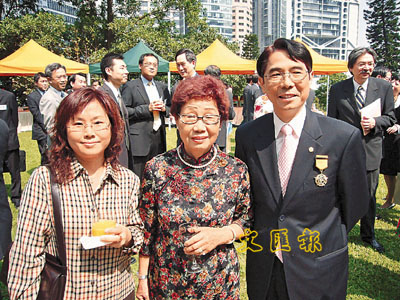 ■獲頒銅紫荊星章的黃國健(右)與媽媽及妻子合照。