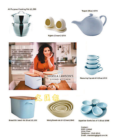 GOD最近便獨家引入Nigella Lawson設計的餐具,大家有機會親身欣賞這位美女廚神的烹飪與設計天份。要學得Nigella Lawson的一手好廚藝,雖然並非人人都可以,但有了其設計的廚具,要布置一個美女廚房,絕對沒有難度。