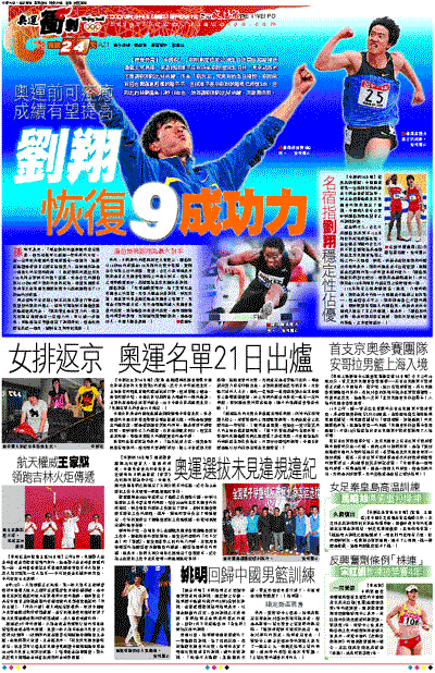 【綜合外電】「中國飛人」劉翔剛度過其25歲生日後開始繼續積極備戰北京奧運,其教練孫海平日前除為劉翔慶祝生日外,更承諾將於下周讓劉翔跑出好成績,作為「劉天王」京奧前的生日禮物。劉翔早前因右腿傷患困擾狀態平平,但孫海平表示劉翔狀態現已恢復9成,但跑出的時間僅為13秒18左右,故將讓劉翔跑出好成績,作激勵作用。