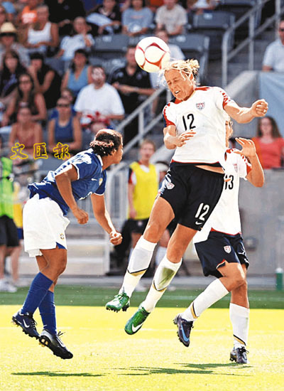 ■美國女足(白衣)周日在科羅拉多與巴西女足的一場友賽中,憑藉洛迪古絲的入球,終以1球小勝。 法新社