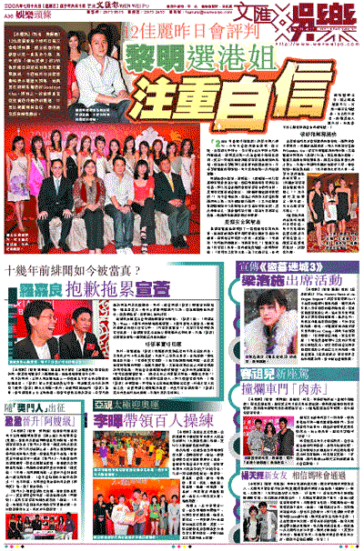 「2008 年香港小姐競選」將於本周六舉行,今年大會評判團由黎明、鄭文雅、王敏超太平紳士、李文俊BBS太平紳士和高佩雲組成。黎明表示第一次為香港小姐擔任評判,笑言一知道要做評判就沒有留意過港姐的新聞,因為他希望能夠以最直接的思維去評分,不希望被報道影響準則,昨日也是他第一次和佳麗接觸。