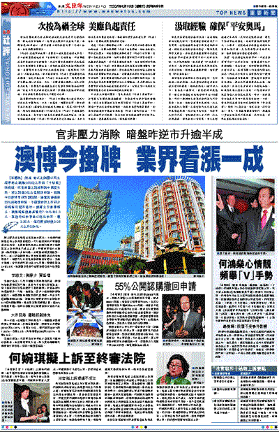 【本報訊】(記者 張以正)試圖以司法程序阻止澳博(0880)上市的「十姑娘」何婉琪,昨在申請上訴的聆訊中再度失敗,被上訴庭3位法官駁回申請。澳博今日按照早前計劃掛牌,儘管其接獲約55%的撤回申請,不過該股於上市前夕的暗盤仍逆市造好。據輝立交易場顯示,澳博暗盤價最高曾升7.14%至3.3元,其後升幅收窄並以低位收市,報3.26元,但仍較招股價3.08元上升5.84%。