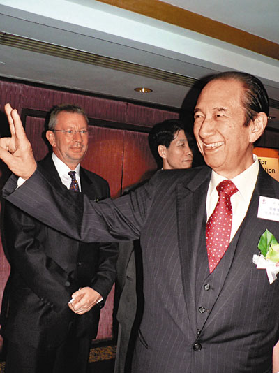 ■贏了官司,何鴻燊向記者舉起勝利手勢。