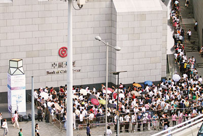 ■中銀香港派發購買港幣奧運紀念鈔票的憑證,中環中銀大廈外人龍排到上山。 本報記者莫雪芝 攝