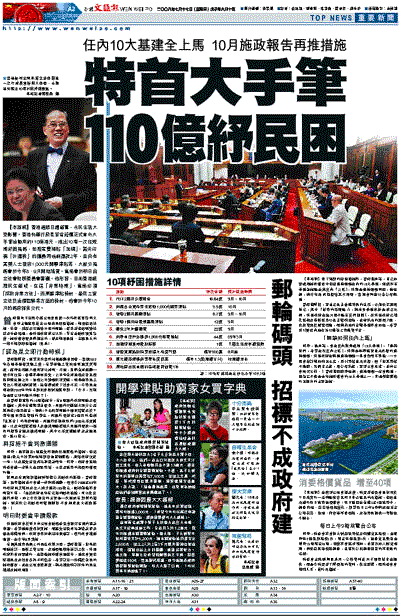 曾蔭權昨日出席今屆立法會最後一次行政長官答問大會時主動宣布推出10項利民紓困措施,範圍包括社福、教育、房屋及交通等方面的津貼,受惠者包括弱勢社群及中產階層,是特區政府成立以來,罕有在財政預算案後、施政報告發表前提出的,涉及範圍最廣、金額最大的一籃子短期紓困措施(見表)。