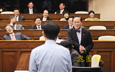 ■李柱銘推「環保輕裝論」,當勞幽默地以「政制熱廚房論」回應,惹來哄堂大笑。本報記者曾慶威 攝