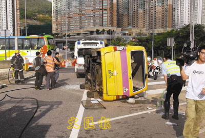 【本報訊】去年底釀成2死15傷的將軍澳寶邑路迴旋處,事隔7個月,交通管制情況仍然混亂,昨晨再釀13人受傷的嚴重車禍,一輛旅遊巴疑「應讓未讓」衝出路口迴旋處,狂撼一輛滿載學童的保母車,保母車在路中打轉翻側,車尾一度冒煙,10名學童、女保母與司機當場浴血被困,幸得一輛路經新巴車長及10多名乘客下車合力抬車救人,事後連同受傷的旅遊巴司機分送兩間醫院救治,一名9歲男童傷勢嚴重。有區議員批評路口仍未加裝交通燈管制,致意外頻生。