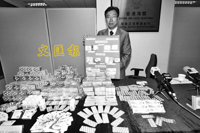 【本報訊】海關搗破一個以「螞蟻搬家」方式,從內地偷運冒牌藥物來港的分銷集團,前日於旺角一個單位內,檢獲治療陽痿及減肥等藥丸共6萬粒,市值270萬元,為今年最大宗,並拘捕集團主腦。海關指,冒牌藥丸防偽商標粗劣,加上集團運作時間不長,估計流出市面不多,呼籲市民遇有懷疑可與藥商聯絡。