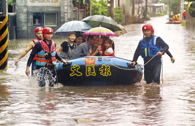 ■在颱風吹襲期間,台中市不少地區水浸嚴重。圖為救援人員用橡皮艇將被困的市民載往安全地點。 路透社
