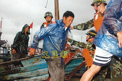 ■18日,溫州邊防官兵幫助被困漁民緊急撤離漁船。 新華社