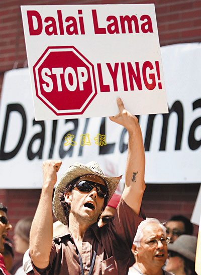 ■示威者高舉「達賴喇嘛,停止說謊!」的標語,抗議達賴到美國賓夕法尼亞州費城。路透社
