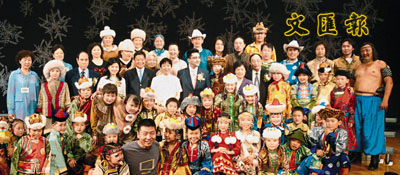 ■《五彩傳說──草原的童年歌謠》演出圓滿結束,呂新華特派員、李小林會長、楊潔篪夫人及何東舜銘主席、陳復生副主席、蘇仲平監事長等與全體演員合照留念。