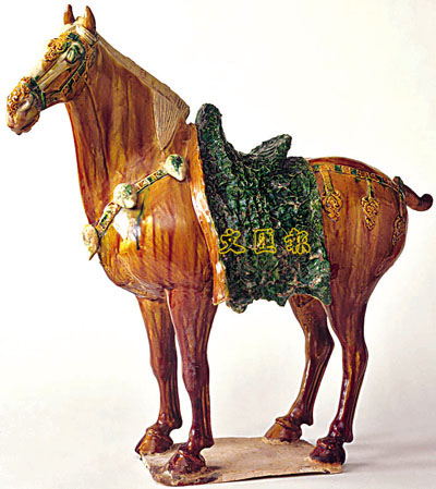 ■唐代「三彩馬」:這件三彩馬是典型唐馬的樣式。馬鬃梳剪整齊,原有的三花已脫落。三花飾馬是當時宮廷貴族間流行的風尚,即所謂「官樣馬」。唐代宮廷貴族豢養的官馬,大部分從中亞地方輸入,稱為「費爾幹納馬」。(a)