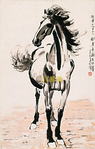 ■徐悲鴻《側身長顧求其群》:徐悲鴻尤愛畫馬,並擅於運用勁利有力的濃淡墨線、準確的透視比例和造型,捕捉駿馬富動感的神態。畫中徐氏自題「側身長顧求其群」,繪畫此畫時正值抗日戰爭長沙會戰期間,畫家托物抒懷,以表達其愛國之情。(a)
