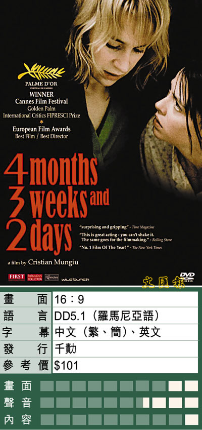 自從《無醫可靠》(The Death of Mr. Lazarescu)及《布加勒斯特以東午後8分》(12:08 East of Bucharest)兩部作品在國際影展揚威之後,我們發現到羅馬尼亞原來正醞釀著一股不忽視的電影新勢力。《4月3周2日—墮胎日記》(4 Months 3 Weeks and 2 Days)這部作品更將之推上高峰——影片在去年的康城影展上,摘下了最高榮譽的金棕櫚大獎,擊退了一眾大師級導演的作品。