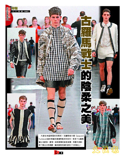 大師也有循規蹈矩的時候。法國時裝大腕 Gaspard Yurkievich設計時髦的春夏男裝成衣系列,受到了古羅馬戰士的啟發,髮帶、短至膝頭的修身短褲、束腰外長套,除了透出女性氣質,還有胸前的設計師的「Y形簽名」。