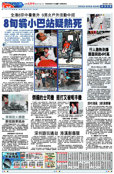 在酷熱天氣下,疑中暑昏迷街頭送院死亡的老翁姓關,80歲。昨日早上9時50分左右,關與76歲老伴李×,頭頂烈日,步經黃大仙下h龍樂樓對開小巴站時,關突告暈倒地上不省人事,老伴慌忙呼救,一名甄姓41歲女途人見狀,立即代為報警。