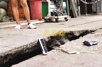 出現地裂「奇景」現場在土瓜灣道近北帝街交界一段行人路,昨下午4時許,有途人發現上址路面石屎出現一條逾5米長的裂痕,部分路面更拱起逾4吋高,一度懷疑地底可能有氣體洩漏,於是報警,警員到場將上址路面封閉,又召來消防及煤氣公司人員進行探測,最後證實並無煤氣或危險氣體發現,不排除路面日久失修或因天熱炎熱,冷縮熱脹造成路面裂開拱起,已通知路政署稍後進行維修。