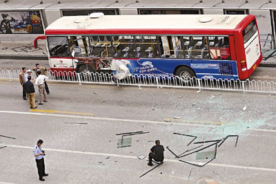 ■爆炸發生後,巴士玻璃碎片飛出十餘米遠。 路透社