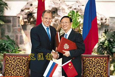 ■21日,楊潔篪與拉夫羅夫在北京簽署了中俄關於國界線東段的補充敘述議定書及其附圖。 中新社