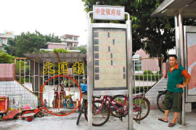 目前,東莞正在全市合力爭創「文明城市」,然而在中堂鎮政府大院內卻還供奉著土地神像。(圖紅圈)神像前插滿了香,附近村民反映每天有老人隔著柵欄跪拜,成了土地廟。