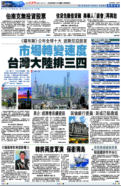 全球一體化下,世界正急速轉變,美國華盛頓社會科技顧問公司遂制訂「改變速度」指數,以測量各國市場的改變速度。指數越高表示改變越快,滿分100。結果發現,波斯尼亞拿滿分排第1,大中華地區也有上榜,台灣和大陸分別得84和76分,排第3和4。