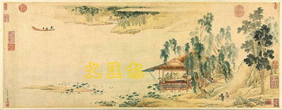 ■仇英在《採蓮圖》中,描畫文人在河畔小亭觀看姑娘採蓮的情形。佳士得圖片