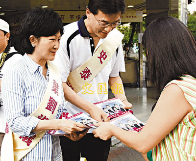 參加「立選」的葉劉淑儀團隊,昨到小西灣富欣花園派發單張,居民反應熱烈,與葉太及史泰祖握手。本報記者彭子文 攝