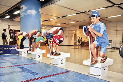 ■為提高奧運氣氛,港鐵在繁忙香港站展出模擬泳池的巨型立體奧運體育展覽,在鬧市中構成有趣的畫面。