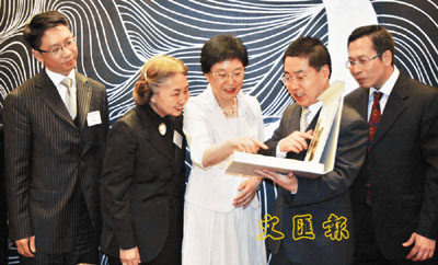 ■省司法廳副廳長黃武、省律師協會會長薛雲華接受羅君美、梁愛詩和袁國強致送的紀念品。