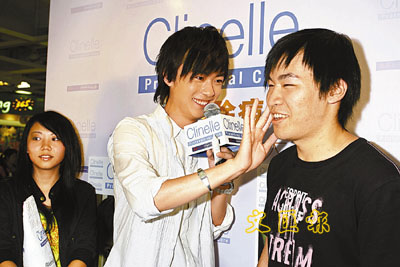 洪卓立(見圖左)昨日在銅鑼灣宣傳代言「暗瘡修護霜」,他表示都市人生活緊張,彷彿已成為每個人的困擾,「工作隨著暑假開始也越來越忙碌,食無定時之外亦不夠休息,加上壓力頗大,以致面上出現了暗瘡。」而洪卓立更為在場Fans大玩遊戲,更親手為歌迷塗上代言暗瘡修護霜,他笑言這位歌迷面上的暗瘡必定比平時更快速痊癒。