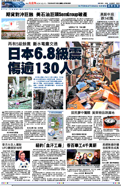 日本東北部繼上月發生7.2級大地震後,昨日凌晨又發生里克特制6.8級強烈地震,傷者逾131人,大多被玻璃碎片或掉下物導致割傷或瘀傷,當中26人重傷,但沒有生命危險。地震導致山泥傾瀉、火車停駛、居民斷電和斷水,政府派出直升機到災區拯救災民。