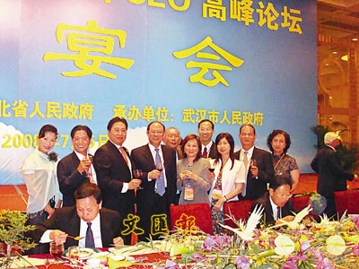 ■國務院台灣事務辦公室常務副主任鄭立中、中聯辦台灣事務部副部長楊親華、國際華商協進會會長蘇永安及各團員於歡迎晚宴合照。