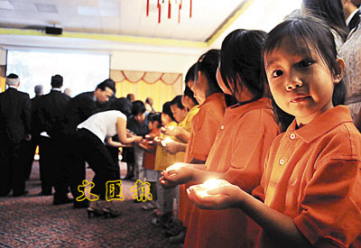 中國駐美大使館24日晚舉辦「答謝美各界援華抗震救災」招待會暨中國抗震救災圖片展,數10名小朋友手捧蠟燭,輕哼歌曲《讓世界充滿愛》,氣氛感人。 中新社