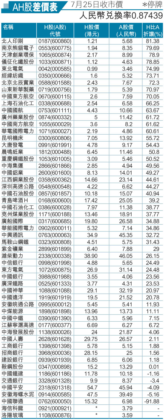 AH股差價表 7月25日收市價 (2008-07-26) (圖)
