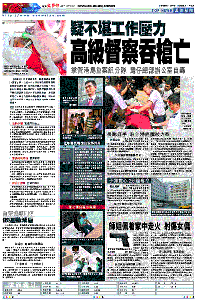 【本報訊】近年嶄露頭角、曾參與調查勒索「X高官」案,仕途一片光明的港島總區重案組高級督察陳功偉,疑因工作壓力及欠債,昨罕有地以佩槍自轟心臟輕生,被同僚發現倒臥灣仔警察總部辦公室內,經送院搶救後,證實傷重死亡。警方在現場檯面檢獲其佩槍,初步相信案件無可疑。警務處處長鄧竟成對事件深感惋惜。