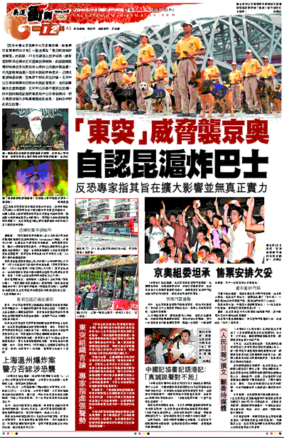 【綜合本報北京新聞中心記者羅洪嘯、駐雲南記者譚旻煦26日電】一個自稱為「東突厥斯坦伊斯蘭黨」的組織,25日在網路上發佈錄像,威脅要對即將召開的北京奧運發動襲擊,該組織還宣稱對近期發生在昆明和上海的公交爆炸案負責。外交部相關負責人接受本報訪問時表示,已經注意到這條新聞,但是暫不對此做出評論。北京市公安局新聞辦主任則向本報記者表示,由於該事情涉及國家層面,北京市公安局不便做出回應。而本報駐雲南記者致電昆明市公安局新聞科,對方稱昆明警方亦是剛剛獲知此消息,目前尚未對此做出回應。