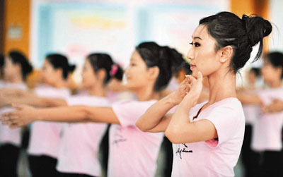 ■昨日,奧運會頒獎專業志願者在培訓結業儀式上,展示形體訓練成果。 新華社