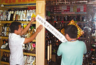 ■去年,羅湖城迎來有史以來規模最大的打假風暴。圖為執法人員在售假商家門前張貼封條。