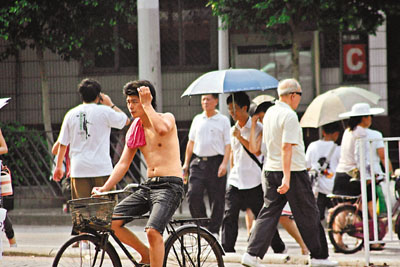 ■由於持續高溫,廣州街頭頻頻出現「膀爺」。 本報記者敖敏輝 攝