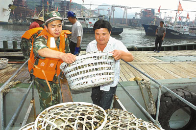 ■26日,邊防官兵趕在「鳳凰」吹襲前,幫助浙江省台州礁山港漁民趕卸漁貨。 新華社